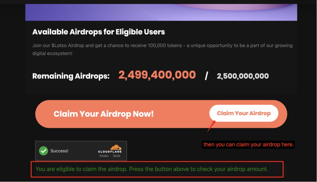 Click our website: Lotso.org, click 'Connect' button and scroll down the webpage to jump to airdrop page.